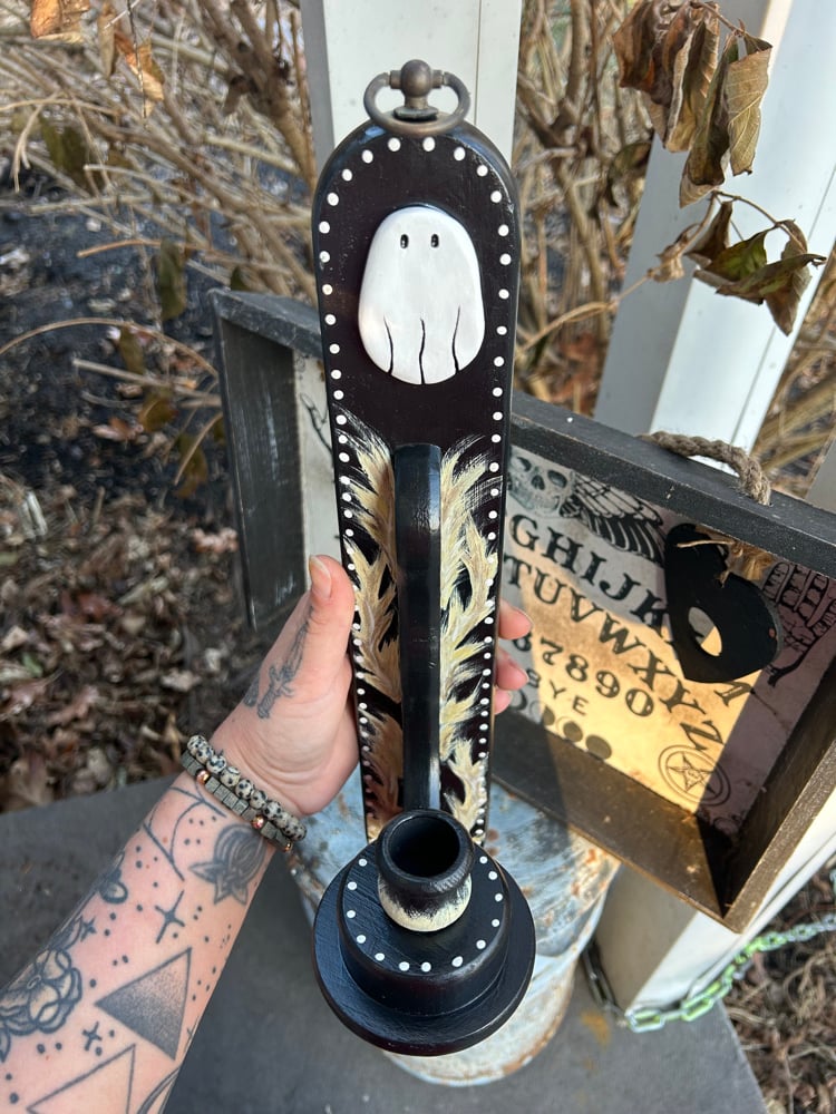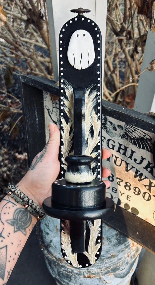 Refurbished candlestick holder. Hand painted with acrylic paint and sealed with gloss. Polymer clay ghost hand painted and sealed.